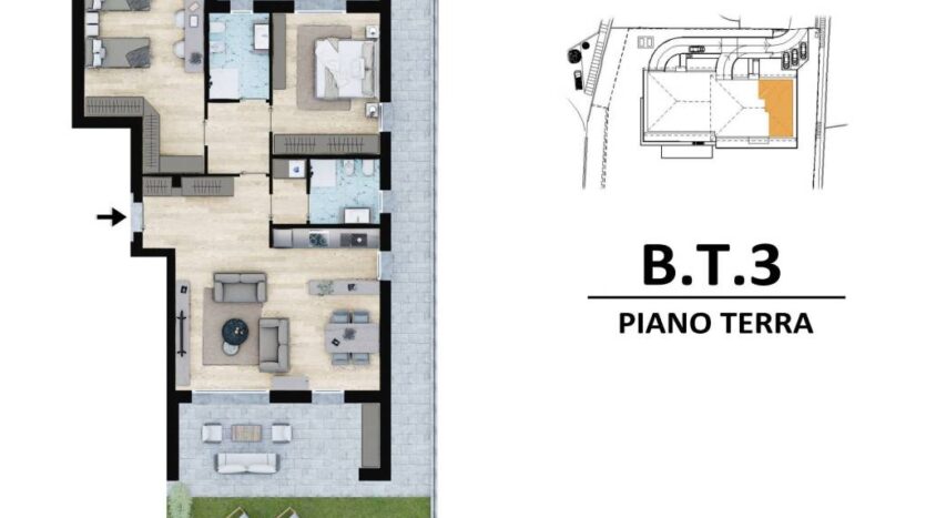 Elegante appartamento situato al piano terra, inserito in un contesto residenziale moderno e curato, caratterizzato da ambienti ampi e ben distribuiti e da generosi spazi esterni privati, ideali per vivere la casa anche all’aperto in totale comfort.