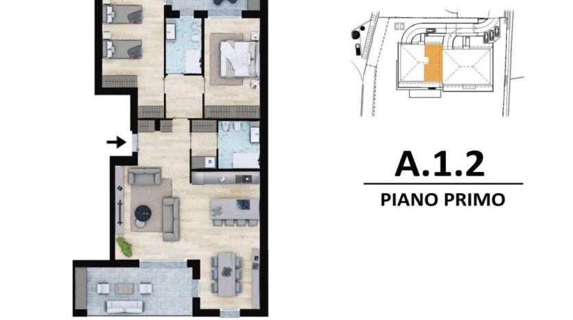 Elegante appartamento situato al piano primo, inserito in un contesto residenziale moderno e curato, caratterizzato da una distribuzione razionale degli spazi e da ampi terrazzi vivibili, ideali per sfruttare al meglio gli spazi esterni in ogni momento della giornata.